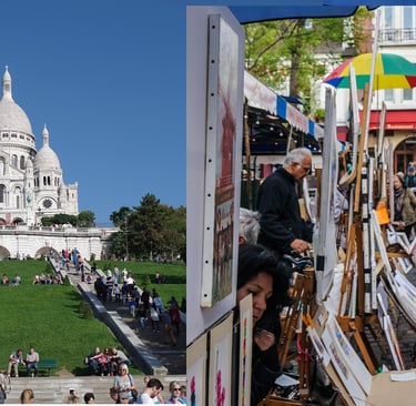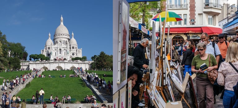 Montmartre - Ascend the charming, winding streets of Montmartre to discover the bohemian soul of Paris, a place that has long inspired artists like Picasso and Dalí. At the summit stands the magnificent Sacré-Cœur Basilica, offering one of the city's most spectacular panoramic views. Lose yourself in the picturesque village atmosphere, where sidewalk cafés, local artists painting in the Place du Tertre, and historic windmills create an unforgettable, romantic ambiance that feels a world away from the busy city below. Experience the unique magic and timeless allure of this artistic hill for yourself—it's a quintessential Parisian memory waiting to be made. Best to explore with a guided tour to discover interesting facts and history.